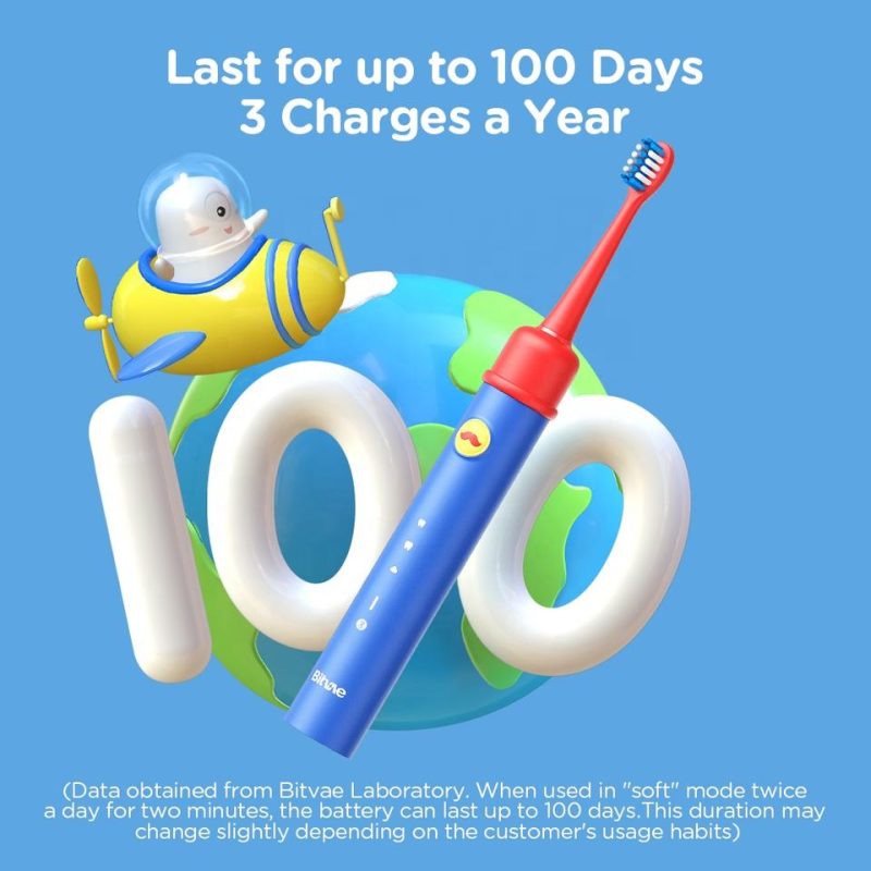 The Rechargeable Toothbrush for Kids has a battery life of up to 100 days when used in gentle mode and can be easily recharged using a USB cable.